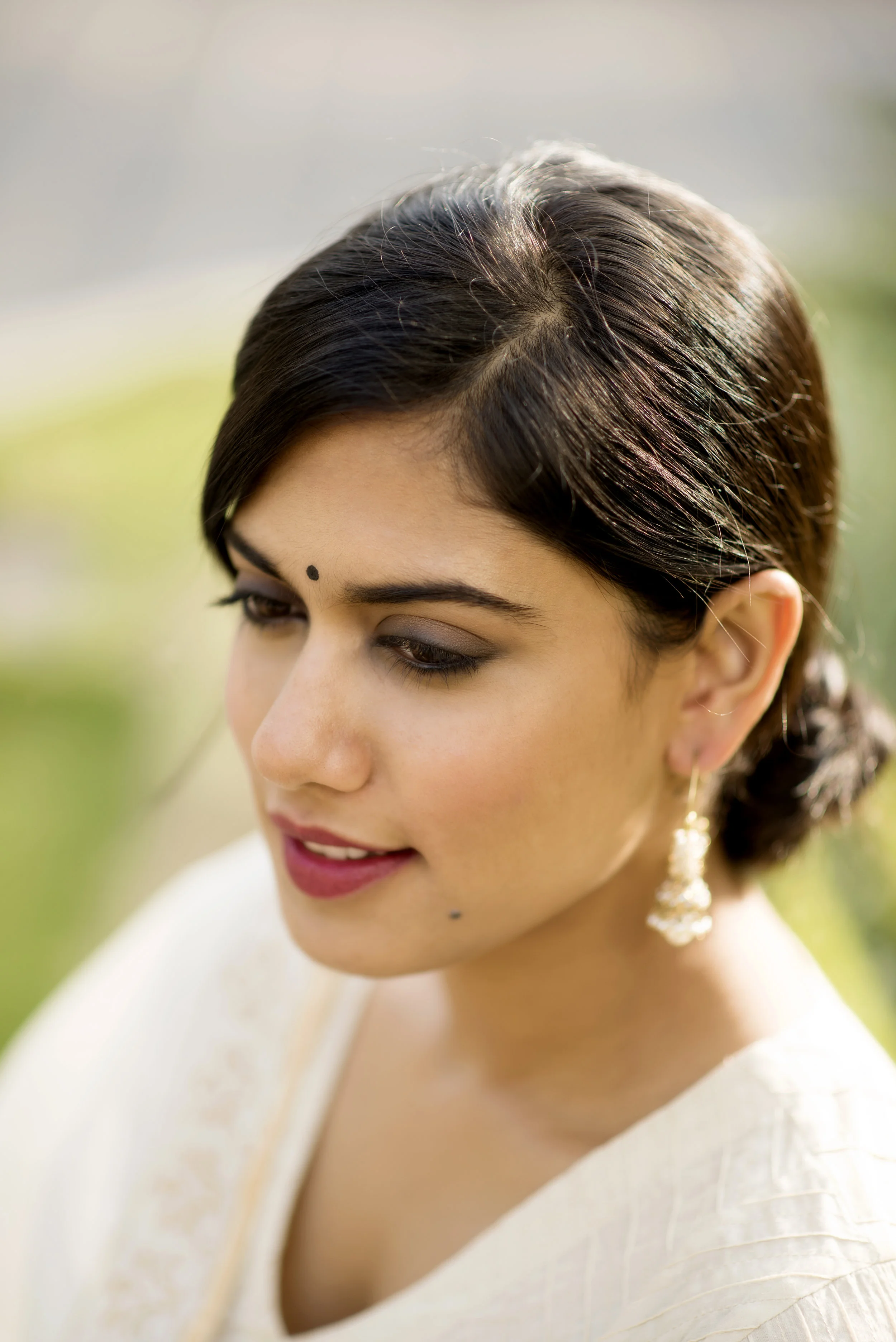 Nothing spells Indian elegance and grandeur at workplace better than a Kota saree or a crisp Chanderi Cotton suit. While Asmita and I were discussing our thoughts on wearing traditional attire at work, she spoke of how it is often her perfect choice for comfort as well as professionalism. I couldn't agree more! I truly enjoyed wearing sarees and other traditional outfits to office while I was working. Soft smokey eyes and a bindi are perfect makeup options to complete a simple yet traditional look at the workplace. Use a medium brown eye shadow all over your lids. Line the upper lash line and lower lash line with a kohl pencil and smudge it out keeping the darkness closest to the lash line. You can choose to add a pop of sparkle just in the centre of the lids with a shimmery gold or bronze shadow. I chose to complete Asmita's look by adding some rich colour to the lips.